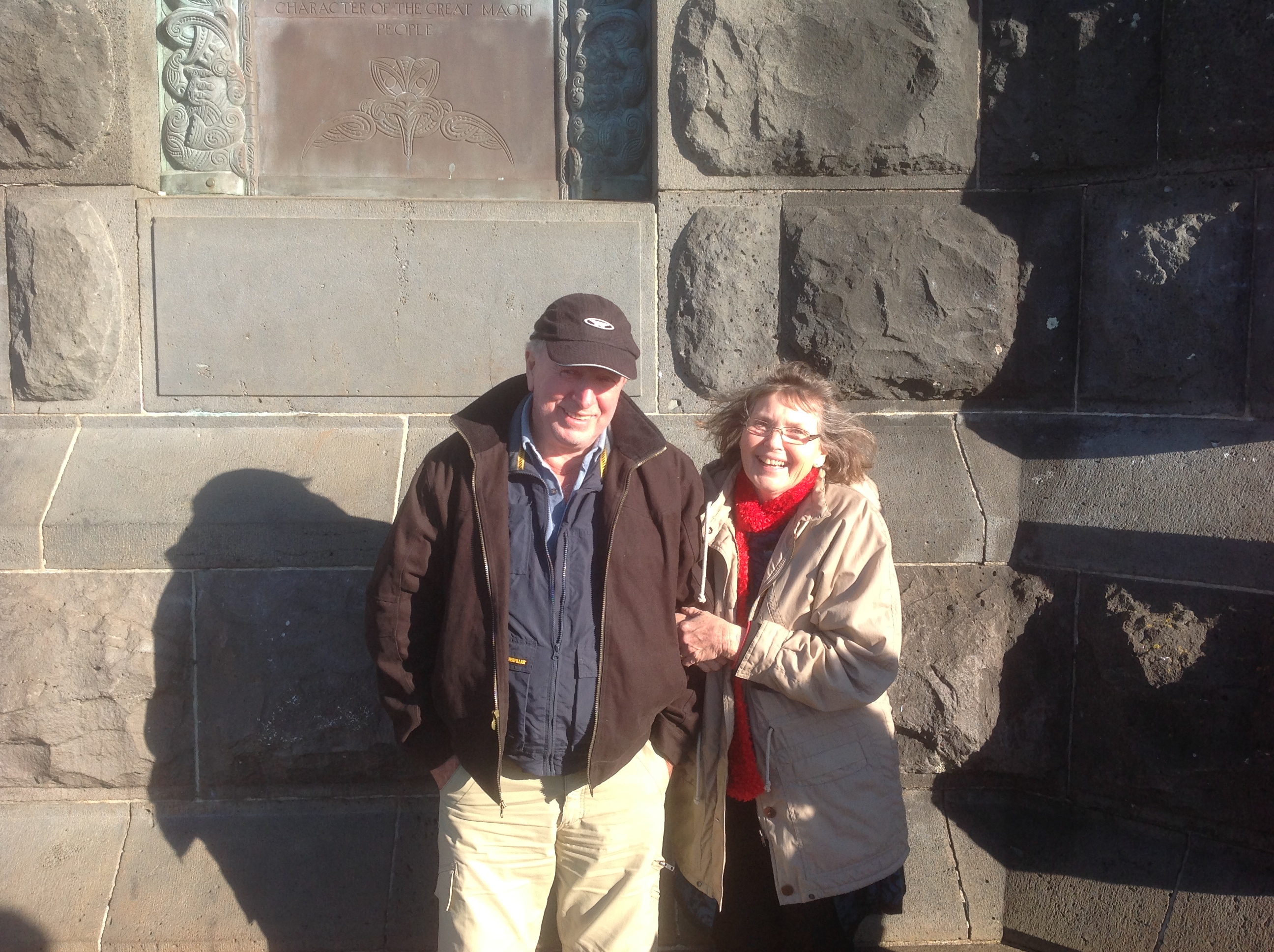 Then we got up at 2:45 a.m. on July 24 and took the 6:30 flight from Brisbane to Auckland on the first part of our journey home. Since we had about six hours layover in Auckland, Barry and Elaine again picked us up at the airport. We were able to meet another couple from Auckland who had been unable to make contact with us earlier. They all took us on a tour of Auckland, and we went up the volcanic cone to the obelisk overlooking Auckland.