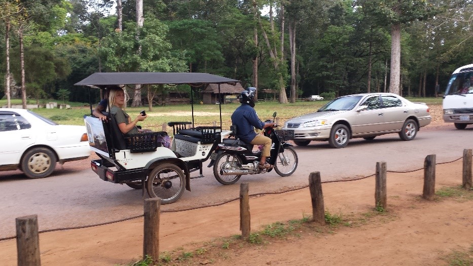 We took the causeway back to the main road just in time to see a tourist being driven in one of the main forms of transportation in Cambodia. They are quite nice, actually.