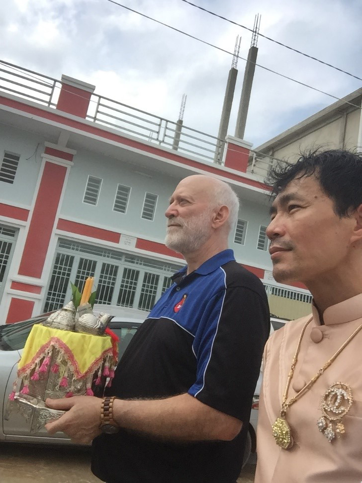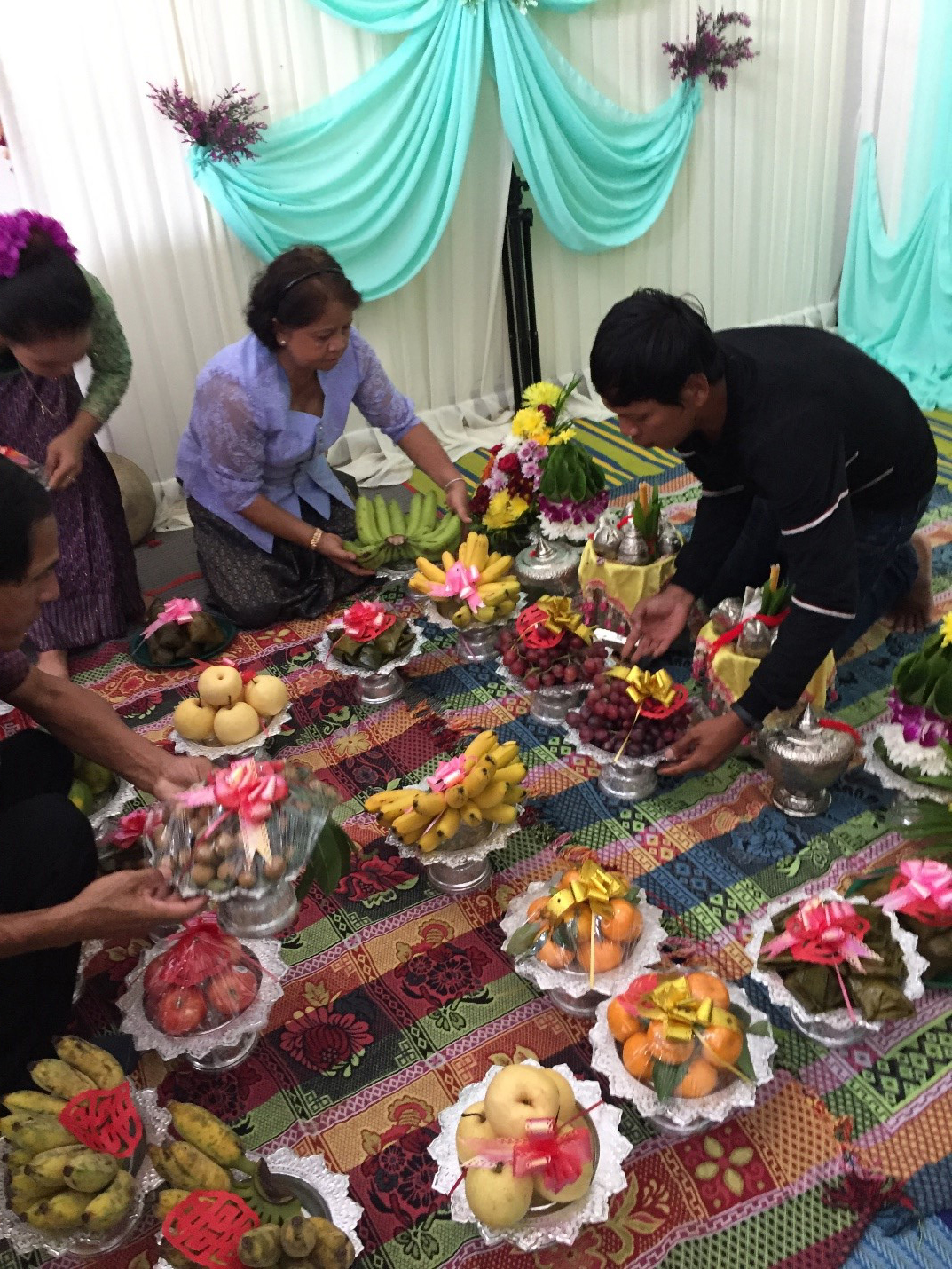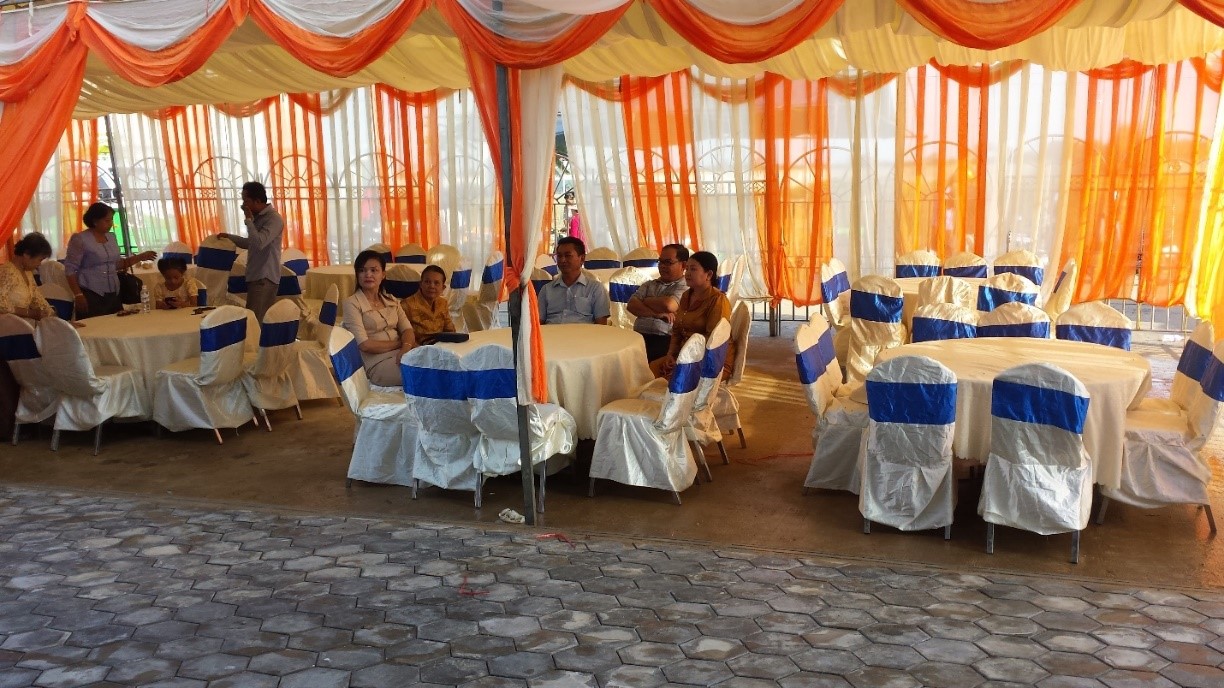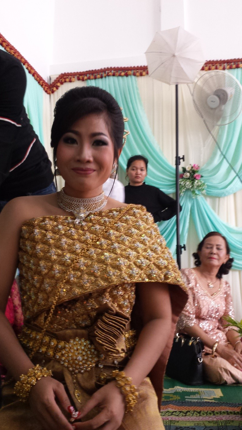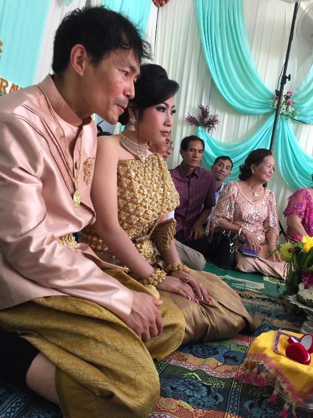 I could not sit on the hard floor in the traditional way, but I was able to sit cross-legged long enough to endure the lengthy (but traditional) speech that someone gave in the Kmer language. The one making the speech was perhaps the closest thing to the officiating minister. I wondered if he might be a Buddhist monk, though he was not dressed in the traditional orange, but S---- assured me that he was not a monk.