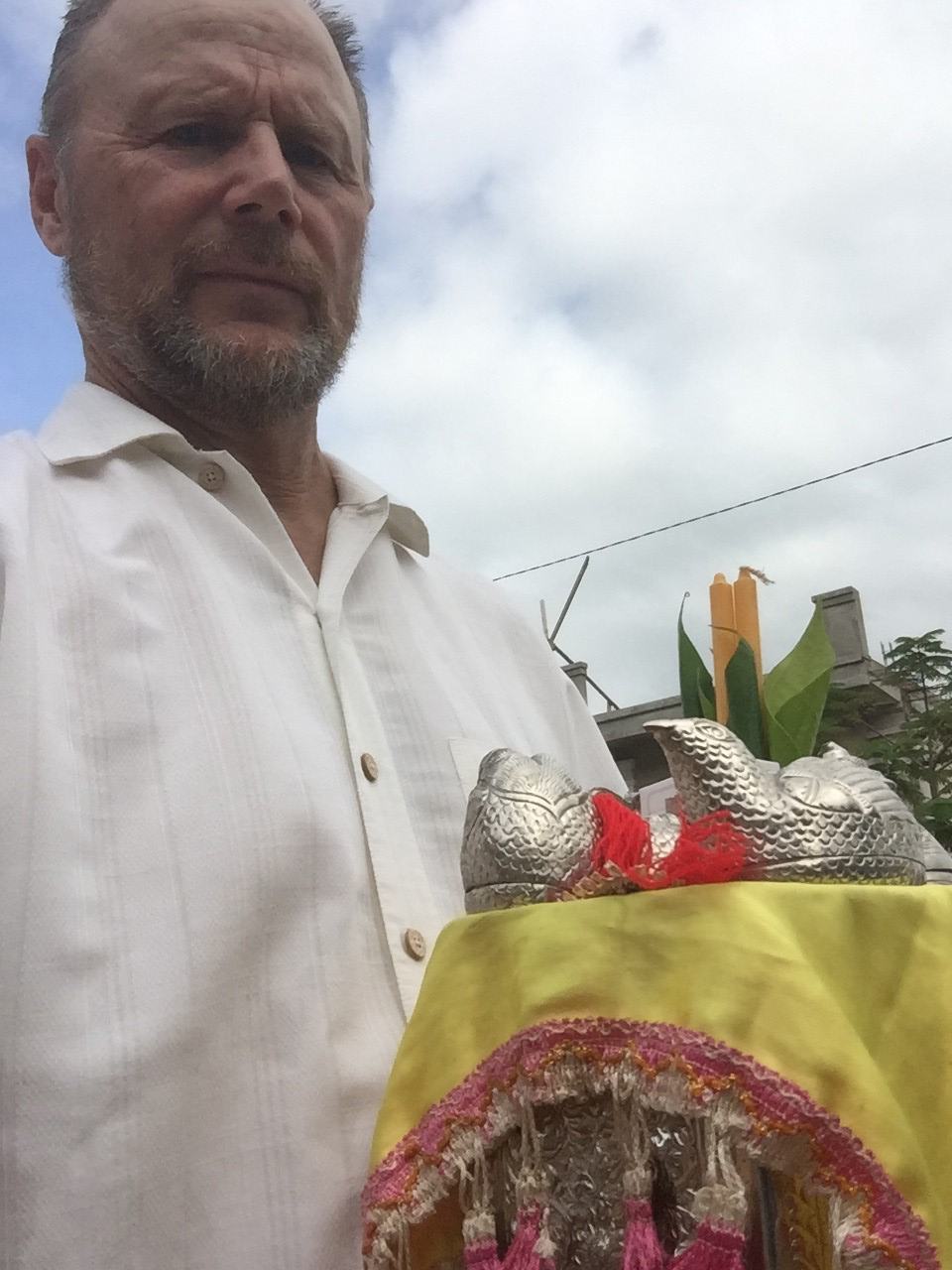 The day came for S----’s engagement ceremony. Neither Brad nor I had taken any dress shirts, but S---- assured me that this would be no problem. The ceremony began on the driveway near the entrance to the condos where D’s parents lived. As “father of the groom,” I led a procession, carrying a traditional vessel of items appropriate to the occasion, while someone alongside of me beat a gong.