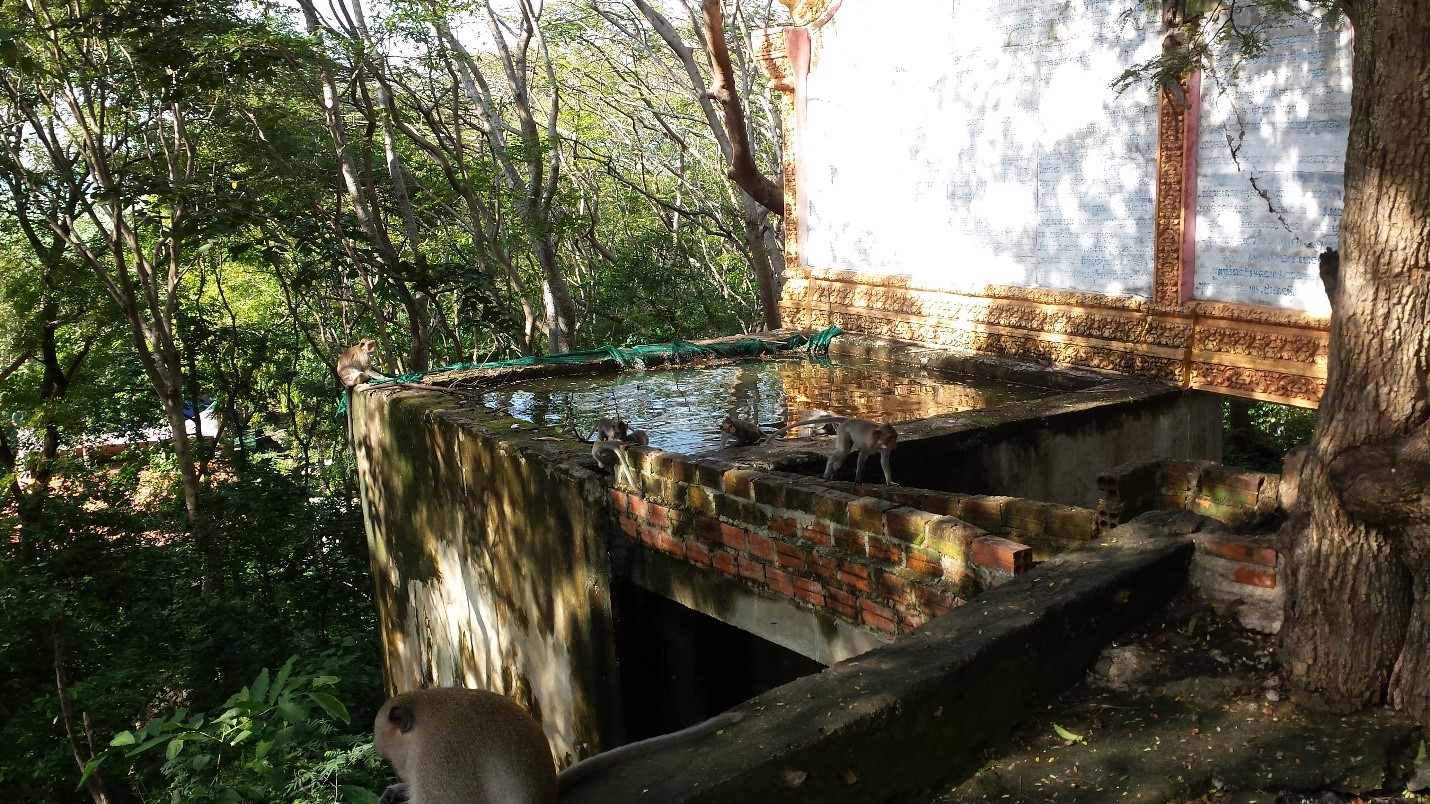 Note the live monkey on his shoulder. Monkeys roamed freely everywhere. Below was their favorite washroom. We passed it while walking up to see the temple.