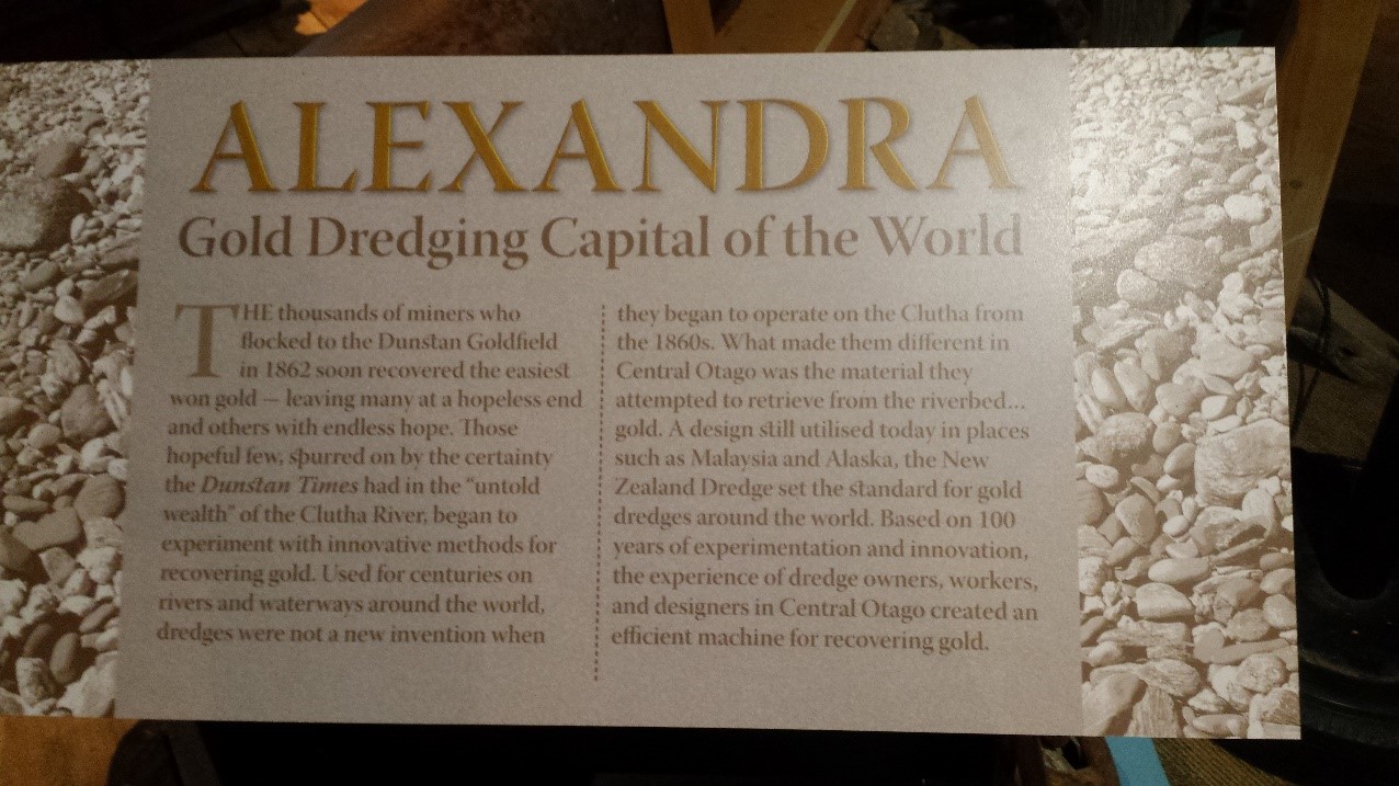 Alexandra is the Gold Dredging Capital of the world, the sign proclaims. After the Dunstain Goldfield was discovered in 1862, the people adapted gold dredging methods to riverbeds.