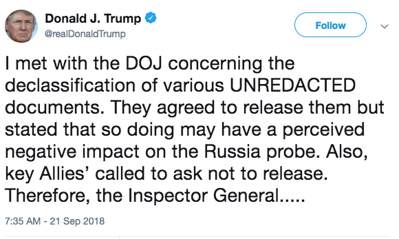 On September 17, 2018 the President declassified parts of the Inspector General’s FISA report and ordered the DOJ and the FBI to release those documents unredacted to the public. This has caused panic in the Washington establishment, as many of them know that once their crimes have been exposed, they can no longer hide behind classified documents.