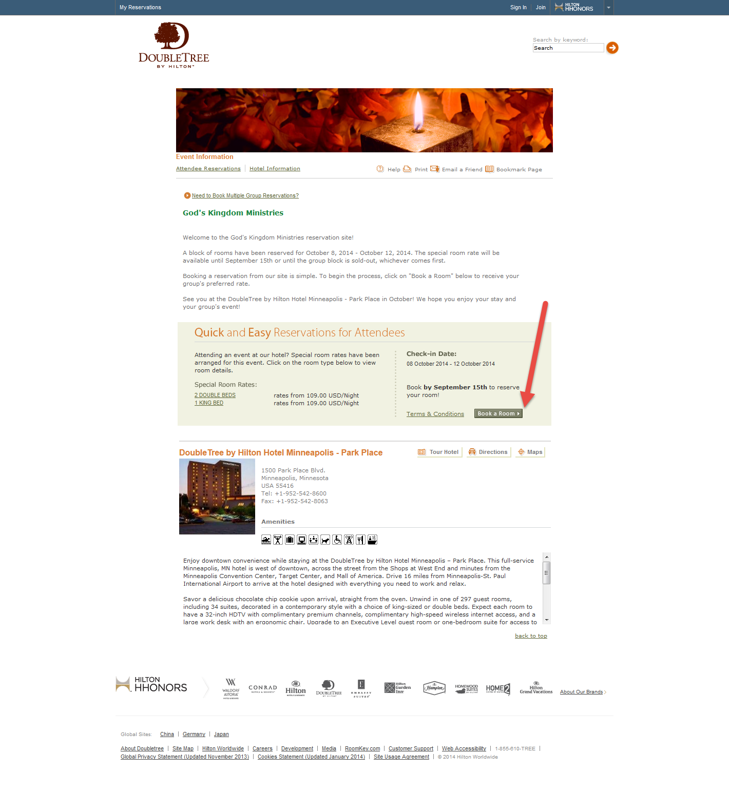 Please ignore anything having to do with "logging in" on the website. The sign in boxes are for our admin, and not for room booking purposes. The image below is simply to help you find the button that you need to click to book your room. You will find that button on the page you are taken to when you click the link below. The image below is an old image, and it shows the old rate of $109/night. The button you click on to book a room will be the same.
