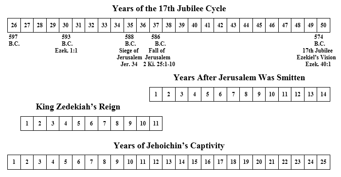 The 17th Jubilee, by our modern way of reckoning, occurred in the fall of 574 B.C., which was just slightly more than 12 years after the fall of Jerusalem (August of 586 B.C. to September of 574 B.C.). But by the Hebrew way of reckoning, it was actually 14 years, because the city fell right at the end of the first year, and Ezekiel’s vision occurred right at the beginning of the 14th year. In actual time, as we reckon it, these events were 12 years and no more than two months apart.