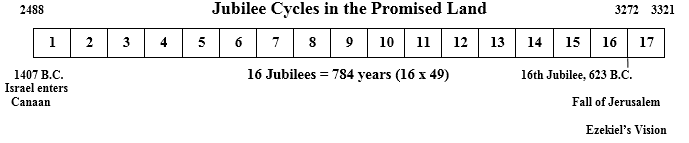 In other words, their entrance into the land would be the point when they would start their Jubilee Calendar, sowing fields and pruning vineyards for six years, then resting the seventh year. The Jubilee would come after seven sabbath rest years were complete. Below is a chart depicting the 17 Jubilee cycles from the Jordan crossing to Ezekiel’s vision 14 years after the fall of Jerusalem.