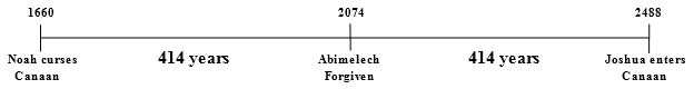 We are given no reason why Noah cursed Canaan instead of Ham, nor will we speculate about it, since that is outside the scope of our present discussion. For our purposes, it is clear that Canaan and his descendants were cursed by Noah, and this put them on Cursed Time. Thus, two periods of 414 years later, Israel crossed the Jordan river under Joshua’s leadership and carried out the sentence of the law against the Canaanites.