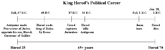 Josephus also tells us that Herod was 25 years old in 47 B.C. when his father appointed him governor of Galilee. (See Antiquities of the Jews, XIV, ix, 2, with footnote.) If king Herod was 25 years old in the year 47-46 B.C., then he was 70 during the year 2-1 B.C. So we must find an eclipse that occurred in 2 or 1 B.C. to determine the time of his death. In our listing, we find there are only two possibilities: one on July 17, 2 B.C., and another on January 9, 1 B.C.