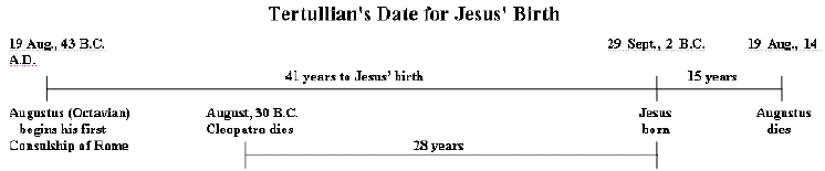 Tertullian dated the birth of Jesus in three ways. First, he said that Jesus was born in the 41st year of Augustus. We know that Augustus (Octavian) began to rule in 43 B.C., so Octavian-later known as Augustus-was first appointed Consul of Rome on August 19, 43 B.C. This is when Roman history dates the beginning of the reign of Octavian. his 41st year went from 3 B.C. to 2 B.C.
