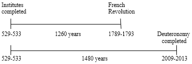 After writing this in the weblog, it occurred to me that the year 2013 might be the end of a 1480-year cycle as well. So I calculated it back to the year 533 A.D., when the Institutes became the law of the Roman Empire.