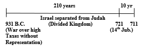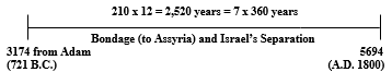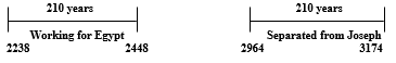 The second time of national distress began when the tribes of Joseph were separated from their brethren after the death of Solomon. The kingdom was divided in 931 B.C. (or 2964 years from Adam), and this condition remained until Israel was deported to Assyria. Samaria was captured in 721 B.C. (or 3174 years from Adam). This shows that Joseph-Israel was separated in the old land for 210 years.