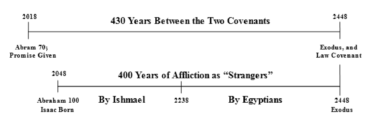 Esto también explica claramente la aparente discrepancia entre los 400 años profetizados en Egipto y los 430 años reales. Es fácil ver que ambos ciclos de tiempo terminan con el año del éxodo. Solo los puntos de inicio difieren. Los 400 años se remontan al nacimiento de Isaac, cuando Abraham tenía 100 años. Este fue el tiempo de la estancia de Isaac como un extranjero. Los 430 años se remontan al mismo día en que Dios hizo Su convenio con Abram (70 años), que comenzó la estadía de Abram como extranjero. Estos dos eventos ocurrieron con 30 años de diferencia.