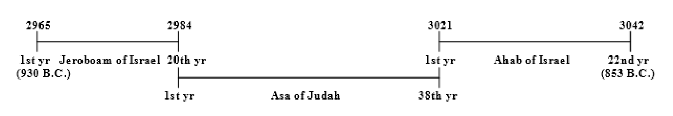 Si el primer año de Asa es 2984, entonces su 38vo año sería el año 3021. Este fue también el primer año del rey Acab de Israel. Acab murió en su 22vo año, que es el año 3042 de Adán. Esta es la fecha eje más importante de la historia antigua, porque aquí es donde la historia bíblica antigua se cruza con la historia secular en el calendario asirio.
