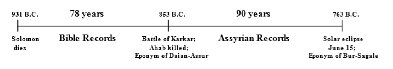 El calendario asirio también nos dice que la batalla de Karkar tuvo lugar 90 años antes de este eclipse solar en el año 6 de Shalmanezer III. Por lo tanto, sabemos que la batalla de Karkar ocurrió en 853 a.C. Esto proporciona pruebas sólidas de la muerte de Acab en el 853 a.C.