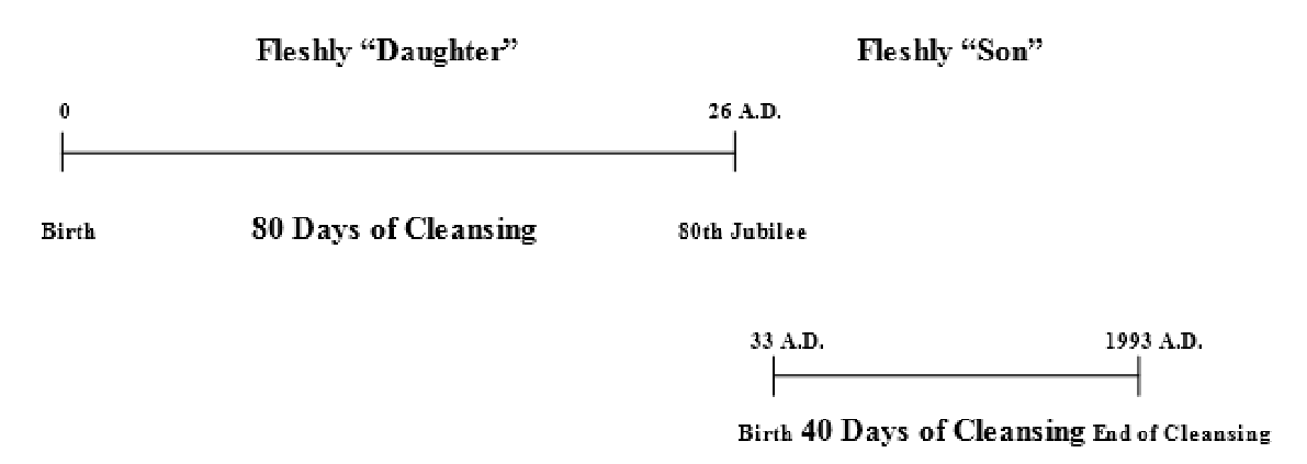 El punto a recordar en esta sección es que la tierra esperó 80 Jubileos para que el Espíritu de Dios eclipsara a los 120 discípulos en el aposento alto en Jerusalén, porque tomó 80 días purificar a la mujer después del nacimiento de lo anímico y lo carnal. Entonces el "hijo" carnal nació en el año 33 d. C., seguido de 40 Jubileos de limpieza. Ahora hemos esperado esos 40 Jubileos. Creo que la explicación de todo esto se encuentra en los ritos de purificación de la ley que se encuentran en Levítico 12. El período total de tiempo es de 120 Jubileos, más el período de demora actual.