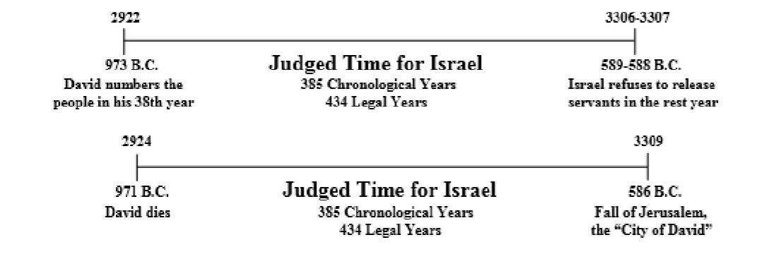 Nuestra conclusión, entonces, es que Jerusalén fue destruida en 586 a. C., 385 años después de la muerte de David. También fueron 385 años cronológicos desde el censo de David hasta el final legal del reinado de Sedequías (589-588 a. C.). Legalmente hablando, Dios puso fin a la ciudad y a la monarquía después de 434 años legales. En esencia, Dios superpuso los reinados de algunos de estos reyes para agrupar 434 años en solo 385. Este es uno de los Secretos del Tiempo que pocos han entendido en tiempos pasados. El hecho de que Dios envió a Jerusalén a un cautiverio de 70 años en Babilonia por su negativa a mantener cualquier año de descanso o Jubileo demuestra que le debía a Dios 70 años como una deuda de tiempo. En otras palabras, Dios los sentenció a 70 años como si hubieran perdido todos los años restantes y los Jubileos de un ciclo de 434 años. ¿Cómo podría Dios hacer esto legalmente? Por la ley del tiempo legal. Durante cada corregencia, Dios imputa el doble de tiempo a la nación.